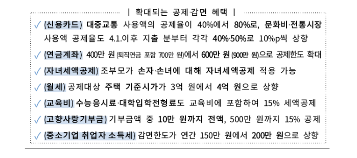 올해는 대중교통 신용카드 사용 공제율이 80%로 두 배로 상향되어 연금계좌 공제한도가 600만원(기존 400만원)으로 확대되는 등 새로운 공제·감면혜택이 많이 생겼습니다.